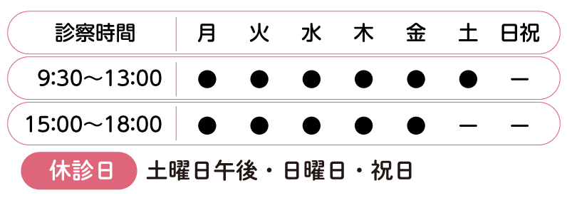 | 診療時間 | 月 | 火 | 水 | 木 | 金 | 土 | 日 |